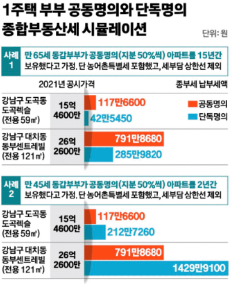 중요한 부분이 공제도 공제인데 각각 6억씩 합치면 12억이기 때문에 과거에 종부세 때문에 단독 명의 있는 거를 공동명의로 증여를 통해서 변경하시는 분들이 많았습니다. 왜냐면 단독 명의 일 때 최대 9억까지 공제가 됐었고, 공동 명의는 각각 6억, 총 12억을 공제 받을 수 있어서 그렇게 증여도 하고 했었는데요, 이제 종부세가 이렇게 바뀌면서 굳이 증여까지 필요가 없어지게 되었습니다.