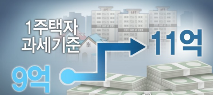 기존의 종부세가 세율도 그렇고 이미 많이 바뀌어 있었기 때문에 많이 바뀐 점은 없는데 그 중에 중요하게 바뀐 것 중에 하나가 종부세 계산을 할때 원래는 인별 과세이다 보니까 공공 명의 더라도 각각 계산이 되어지는 부분이 있었는데 이번에 바뀐 부분은, 1세대 1주택일때 종부세에서 1주택 1세대라고 하면 1명이 온전히 100% 가지고 있을 때만 즉, 단독 명의일 때 1세대 1주택 규정을 적용했었는데 이 경우에 공제가 원래는 9억원이었습니다. 그런데 이제 각각 공동명의이거나 이럴 때는 각각 6억원이지만 단독 명의 일때 9억원 공제가 11억으로 바뀌었습니다.
