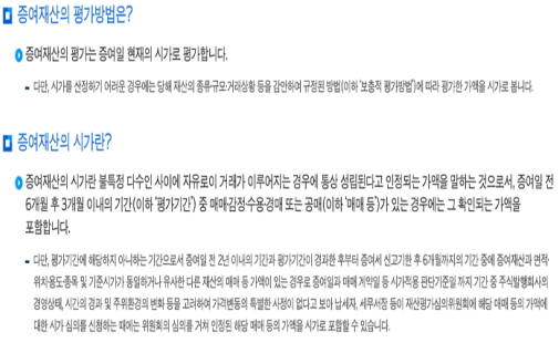 주식의 경우에는 상장주식, 코스닥상장주식은 증여일 이전, 이후 각 2월간에 공표된 매일의 최종시세가액의 평균액입니다. 그 외, 유가증권시장 상장 추진 중, 코스닥시장 상장추진 중, 비상장주식에 대해서도 자세하게 나와있으니 사진을 참고하세요.